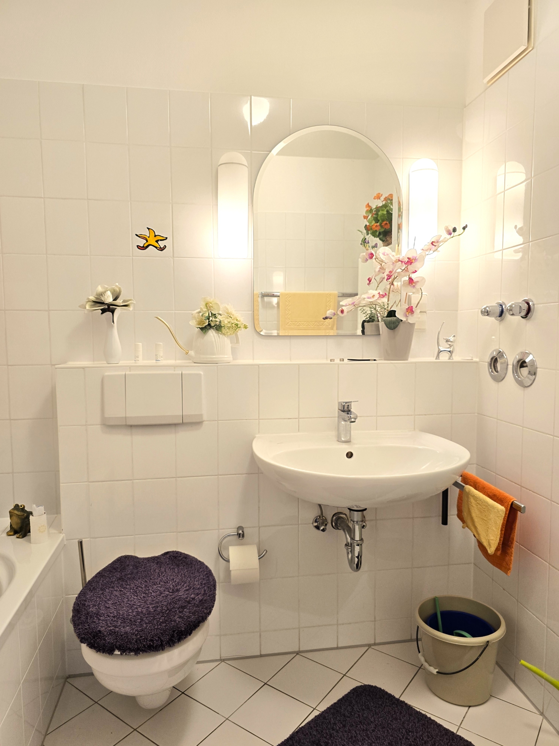 Von der Diele kommt man in das hell geflieste Badezimmer, welches durch seine große Badewanne besticht.